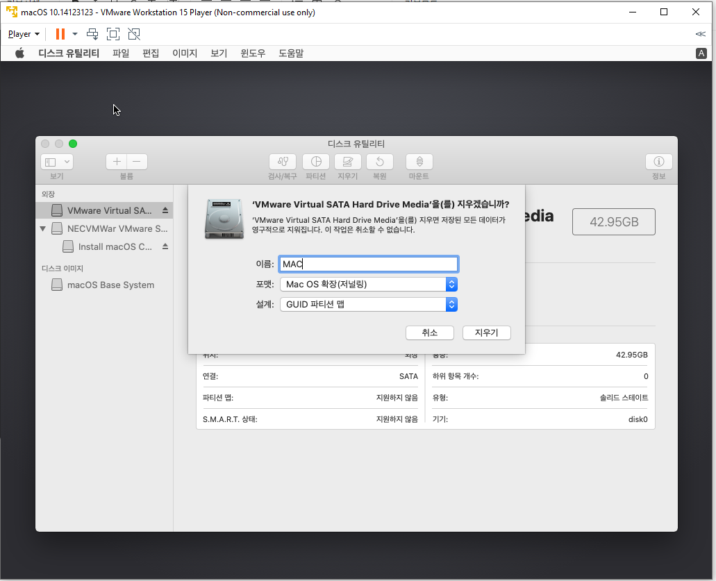 Vmware Virtual SAS 디스크 -> 지우기에 들어가 디스크를 포맷한다.