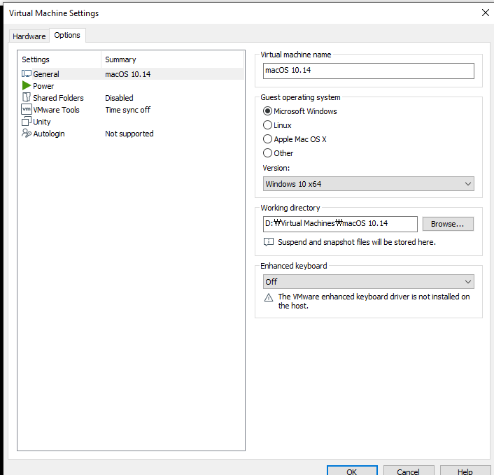 Options -> Guest Operation System을 macOS에서 Windows 10으로 변경해준다.