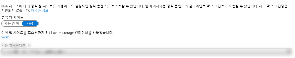 스토리지 계정 -> 정적 웹사이트 탭에서 정적 웹 사이트를 활성화한 뒤 인덱스 파일의 이름을 입력한다.