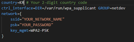 그리고 wpa_supplicant.conf 에 위 코드를 입력해줍니다. ssid, psk, key_mgmt는 자신의 AP에 맞게 설정해주세요. 그리고 국가를 꼭! US로 설정해야합니다.