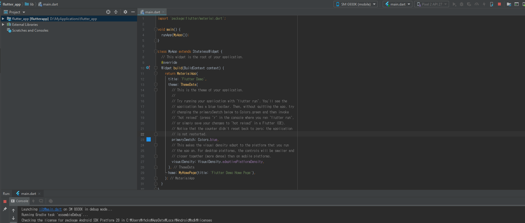 안드로이드 스튜디오에서 플러터 프로젝트를 생성해보자.