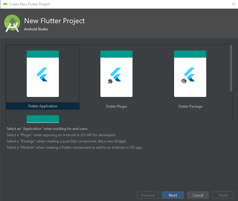 Flutter Application을 선택한 후 Next를 클릭한다.