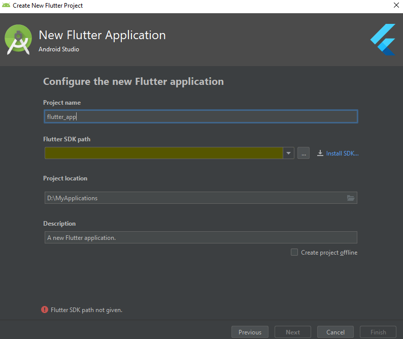Project Name, Location, Description은 임의로 설정하고, SDK path가 비어있다면 Install SDK를 설치하면 된다.
