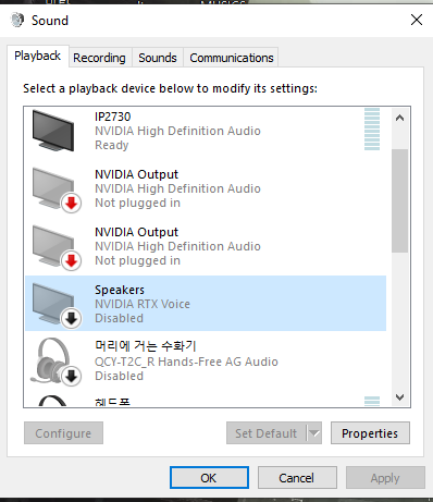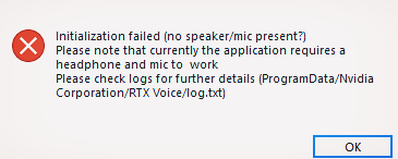 윈도우 업데이트 등의 이유로 initialization failed no speaker/mic present 라는 오류와 함께 RTX Voice가 실행이 되지 않을 때가 있다. 이를 해결하기 위한 방법은 2가지가 있다. 쉬운 것부터 시도해보자.