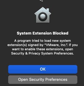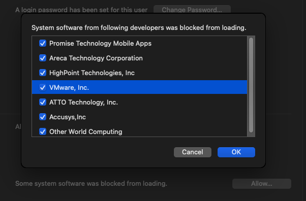 만약 이런 경고가 뜬다면 Some system software was blocked from loading 문구 옆에 있는 Allow에 들어가 VMware를 활성화해주자.