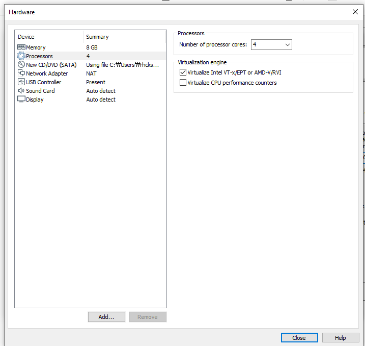 램은 4G 이상, 프로세서는 2 코어 이상으로 해준후, AMD-V를 활성화해준다.
