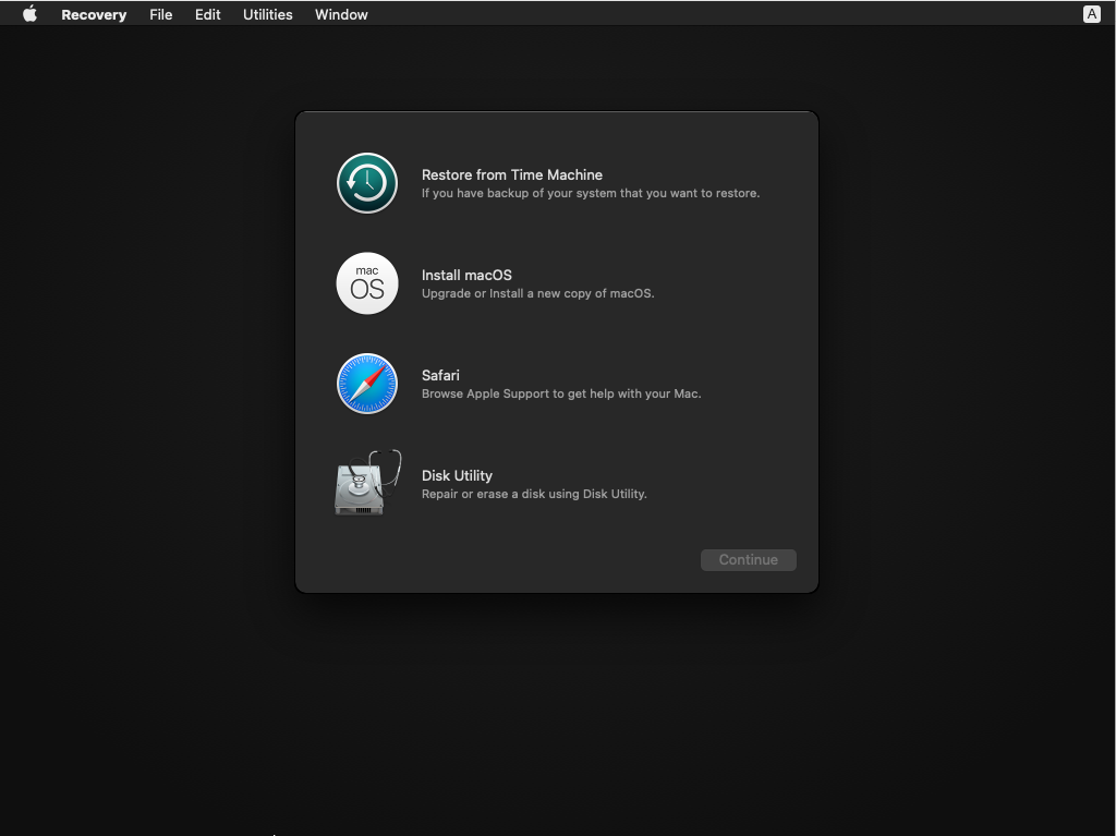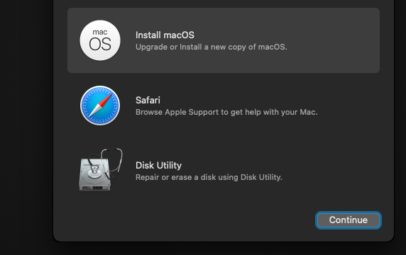X를 눌러 밖으로 나가고, Install macOS를 클릭한 후 진행한다.
