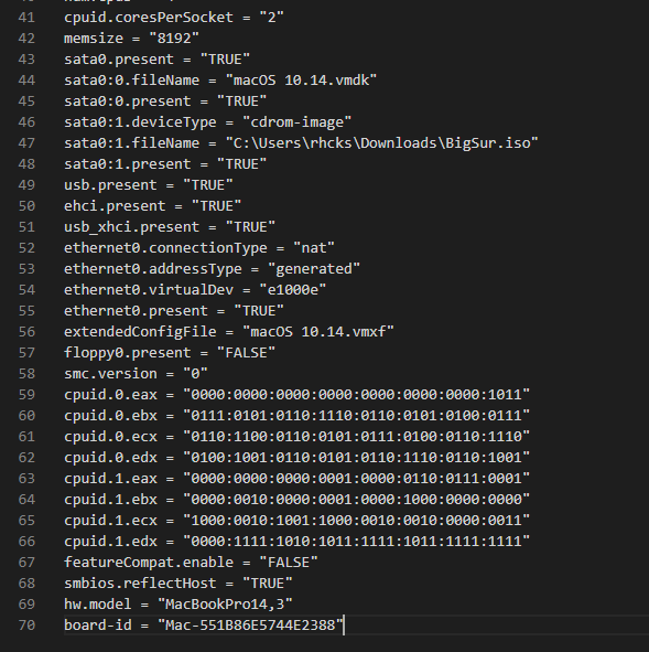 CODE 파일을 실행해서 내용을 복사한 후, vmx 안에 붙여 넣어준다.
