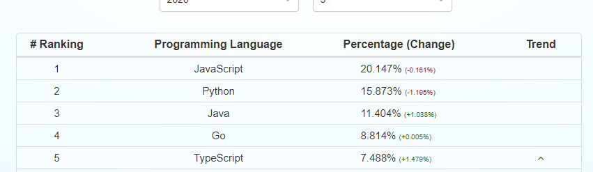 이를 통해 얻는 장점은 기존 자바스크립트 프로젝트들을 흡수할 수 있다는 것이다. 자바스크립트는 압도적인 Github 라이브러리들과 (TypeScript도 5위!), 높은 마켓쉐어를 가지고 있다.