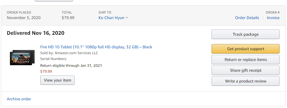 이번에 아마존에서 파이어 hd 10이 79.99불로 세일하길래 냉큼 집어왔습니다. 배대지는 오마이집을 사용했고, 고정가 + 슬림 서비스 이용해서 6.99 달러 결제했습니다. 배송 시간은 약 3주 정도 걸렸습니다.