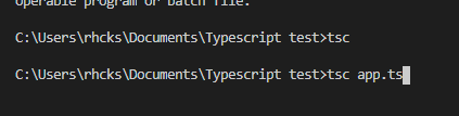 tec "파일 이름" 명령어로 타입스크립트 코드를 자바스크립트 코드로 변환한다.