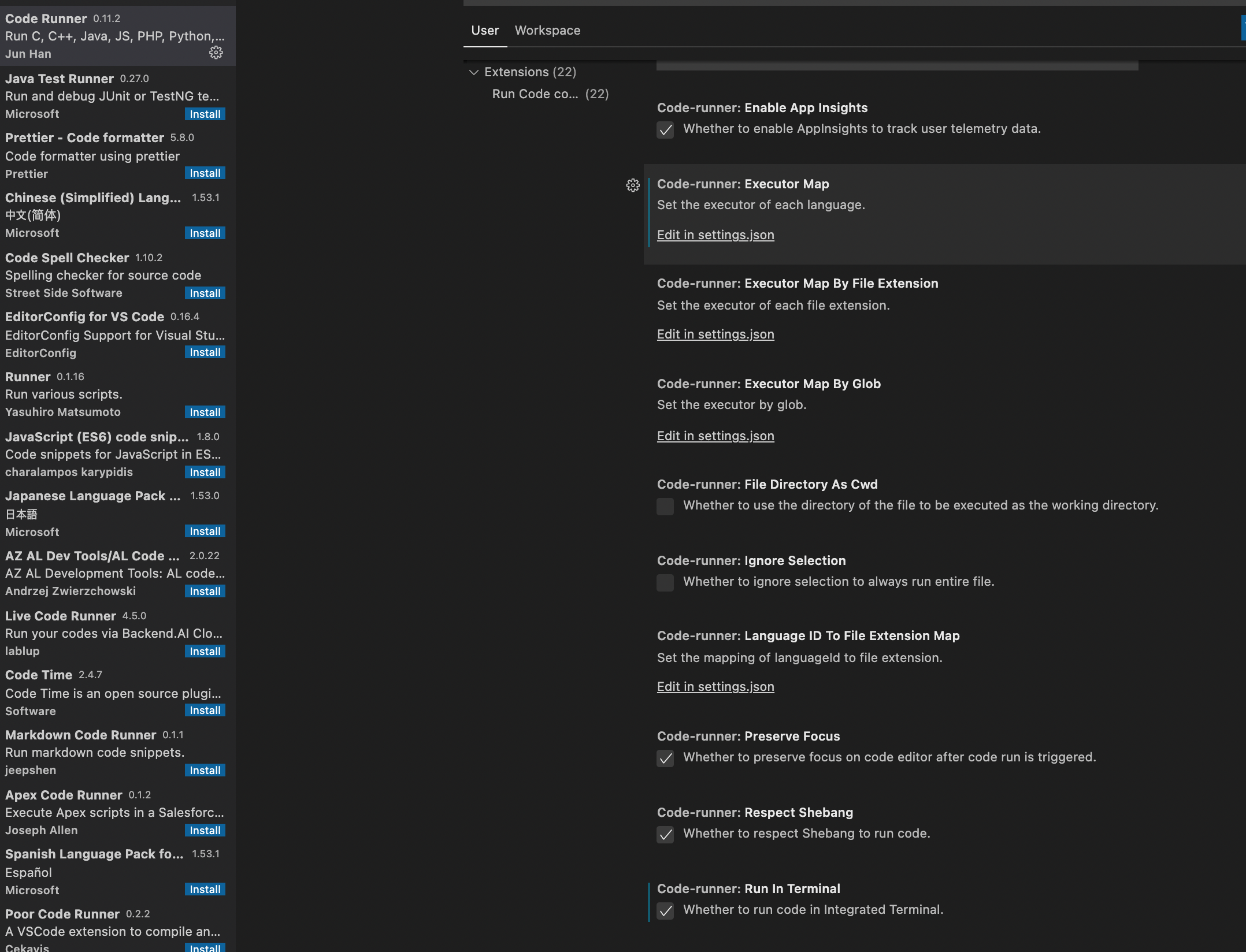 Code Runner의 설정에 들어가서 Run In Terminal 부분을 활성화해준 후, Executor Map -> Edit in settings.json 을 클릭한다.