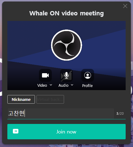 카메라 설정창이다. 카메라와 오디오를 잘 설정한 후 회의 참가를 클릭한다.