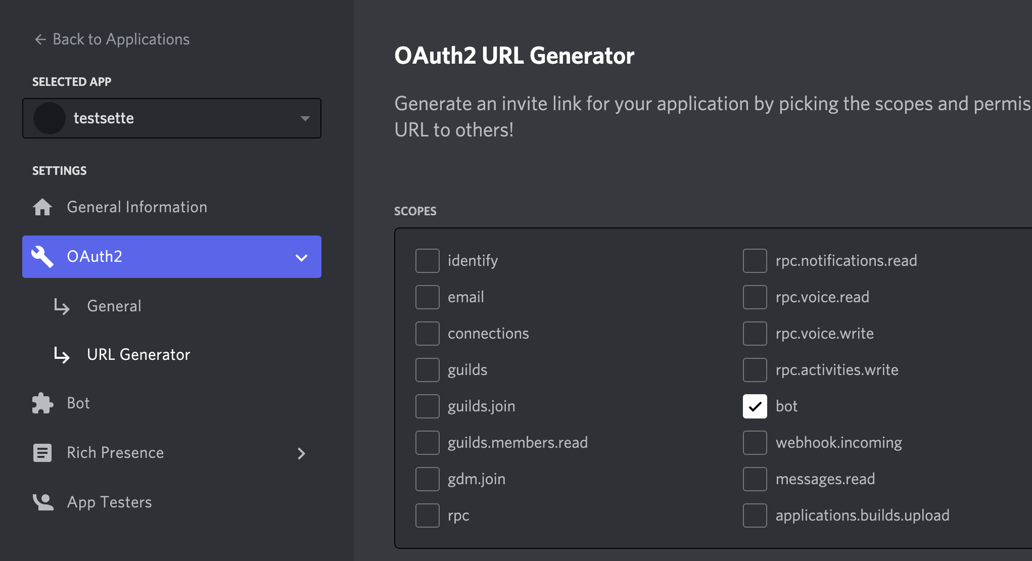 OAuth2 -> bot 선택 -> 하단의 링크 접속을 통해 서버에 봇을 추가합니다.