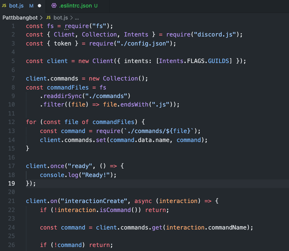 위 깃허브 링크에 있는 기본 코드를 복사하여 bot.js와 config.json을 생성합니다.