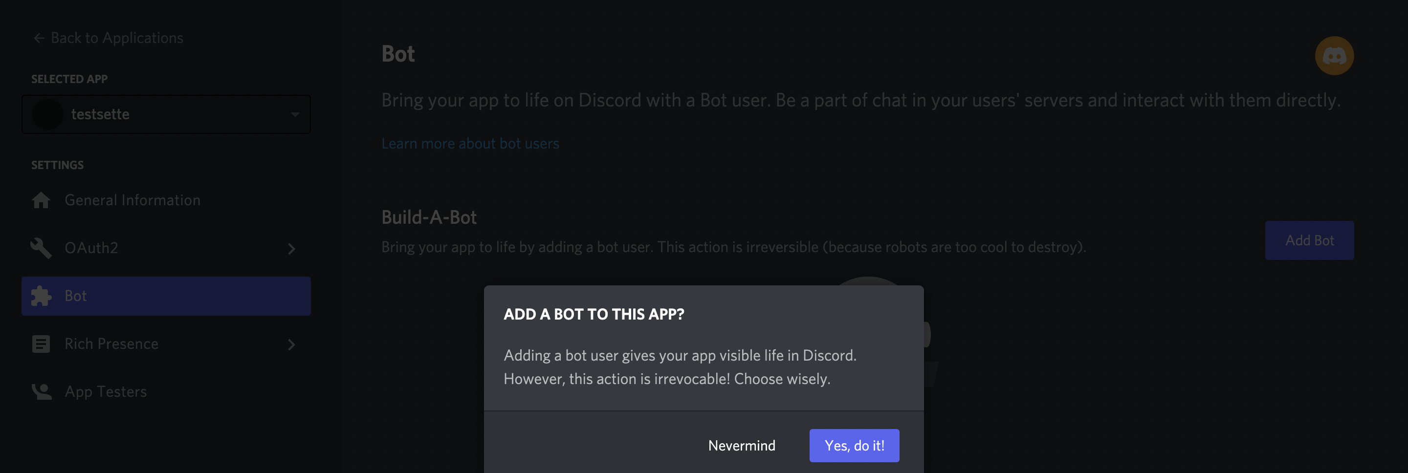 Bot 탭에 들어가 봇을 하나 생성합니다.