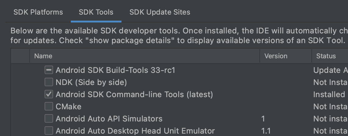 SDK Tools 탭에서 Android SDK Command-line tools가 활성화되어 있는지 확인한다.