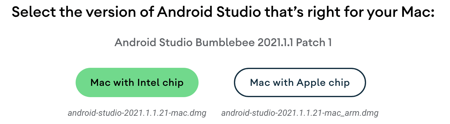 먼저 안드로이드 스튜디오를 설치해준다. 이때 Mac with Apple chip을 선택해 ARM용 설치 파일을 다운로드한다.