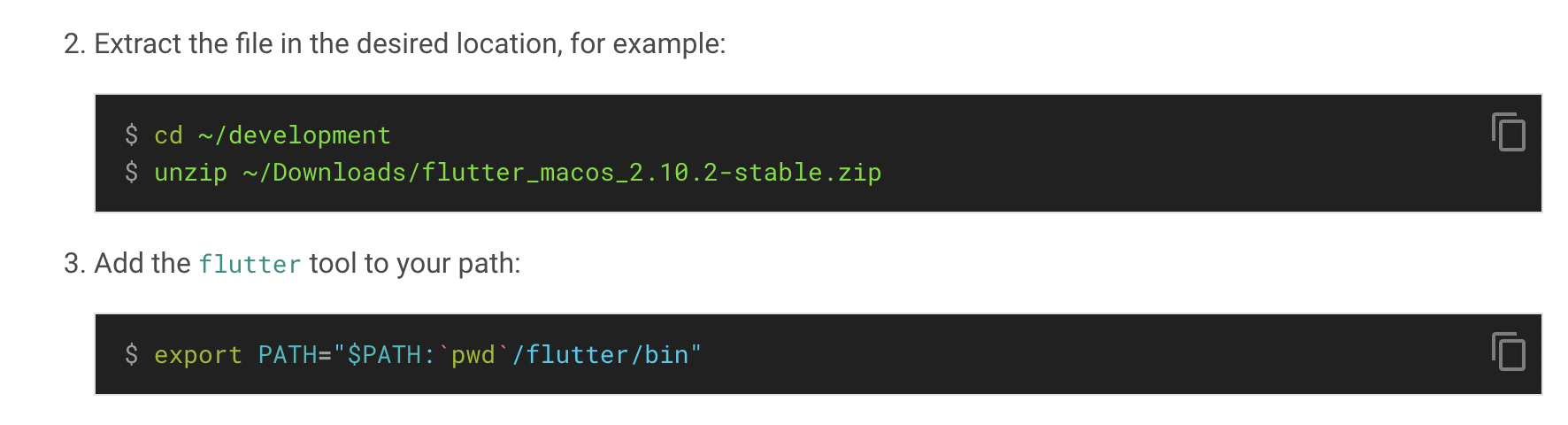 설치 파일의 압축을 풀어주고, flutter 명령어를 추가해준다. (현재 실행 중인 터미널 창에만 적용된다.)