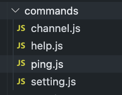 discordjs 프로젝트 폴더에 commands 폴더를 생성하고, 그 안에 명령어 파일을 추가한다. 나는 테스트를 위해 ping.js를 추가했다.