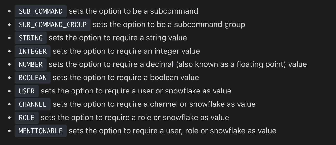 data 부분은 명령어의 이름과 세부사항을 담고 있다. Option들의 타입은 다음과 같다.