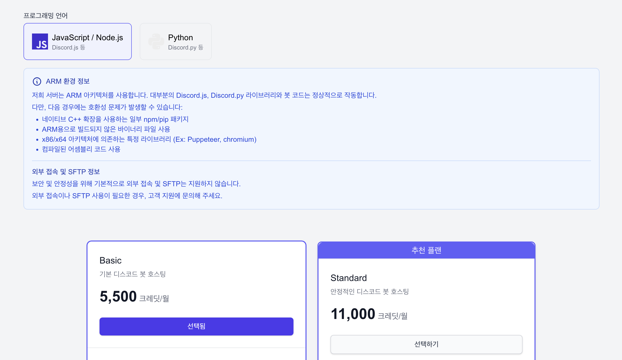 구매하신 크레딧으로 봇 플랜을 구매하실 수 있습니다. 봇 플랜은 월정액으로 결제되며, 필요하신 사양에 맞게 구매하시면 됩니다. 서버는 ARM 아키텍쳐 기반입니다. Node.JS와 Python은 인터프리터 언어이기 때문에, x86 아키텍처에 의존하는 특정 라이브러리를 사용하시지 않는 대부분의 경우에서 정상작동합니다.